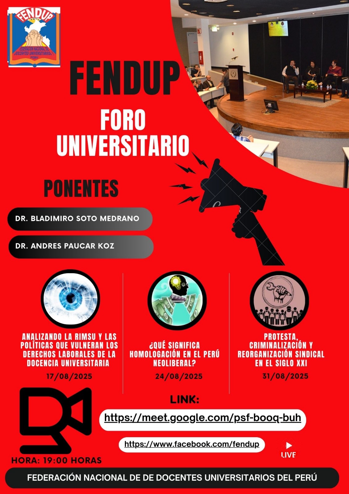 La Federación Nacional de Docentes Universitarios del Perú (FENDUP) tiene el agrado de invitar a toda la comunidad universitaria a participar en el Foro Universitario, un espacio de análisis, debate y construcción colectiva frente a los desafíos de la docencia universitaria en el país.